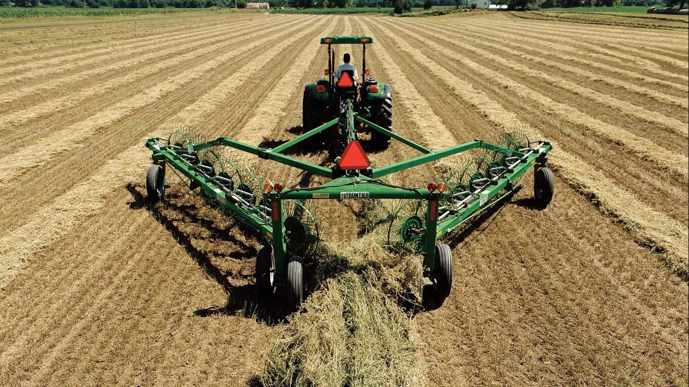 The limited oscillating, offset tandem wheels on the Frontier™ WR12 Series High-Capacity Wheel Rake ensure a smooth ride, even over irrigation tracks.
