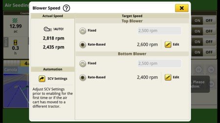 No more manually adjusting hydraulic flow levels to chase your desired blower speed, set the blower speed for a given product application rate and forget it. John Deere blower speed automation maintains air cart blower speed within operator preset thresholds when C-Series Air Carts are operated with John Deere tractors*. The system adjusts hydraulic flow to maintain the blower  speed as operating or environmental conditions change.  You can preset target blower speeds for up to 6 product application rates on your Gen 4 or G5 display.