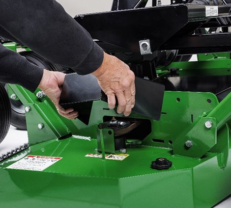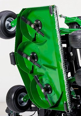 The parallel side frame combined with deck baffling on the rear half of the decks, promotes evenly spread material across the entire width of the deck, improving clipping dispersal, preventing clumps and windrowing.