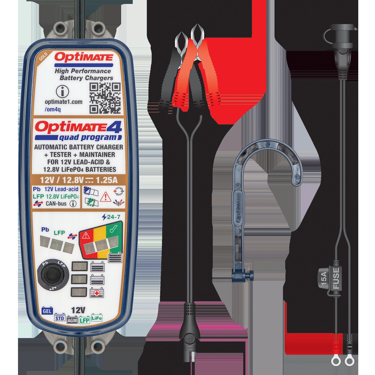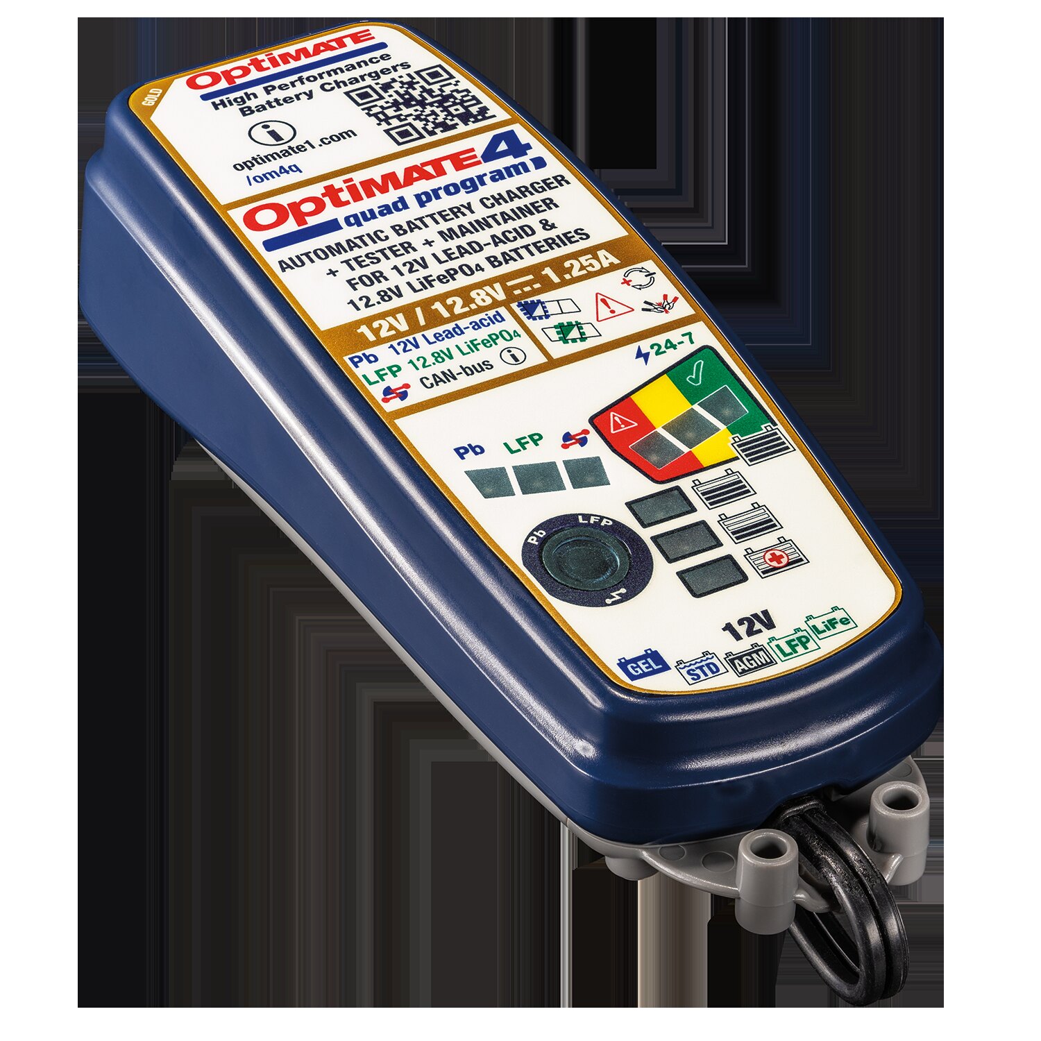 OptiMate 4 Quad Program is the ultimate battery charger for the high technology 12V / 12.8V battery in your adventure, touring, cruiser or performance motorcycle, or ATV, Side by Side and personal watercraft ? the world's most advanced power-sport battery charger! Fully automatic multi-step program brings the battery safely to full charge ? Select by battery type & charge requirement and OptiMate 4 Quad Program does the rest, no supervision required!